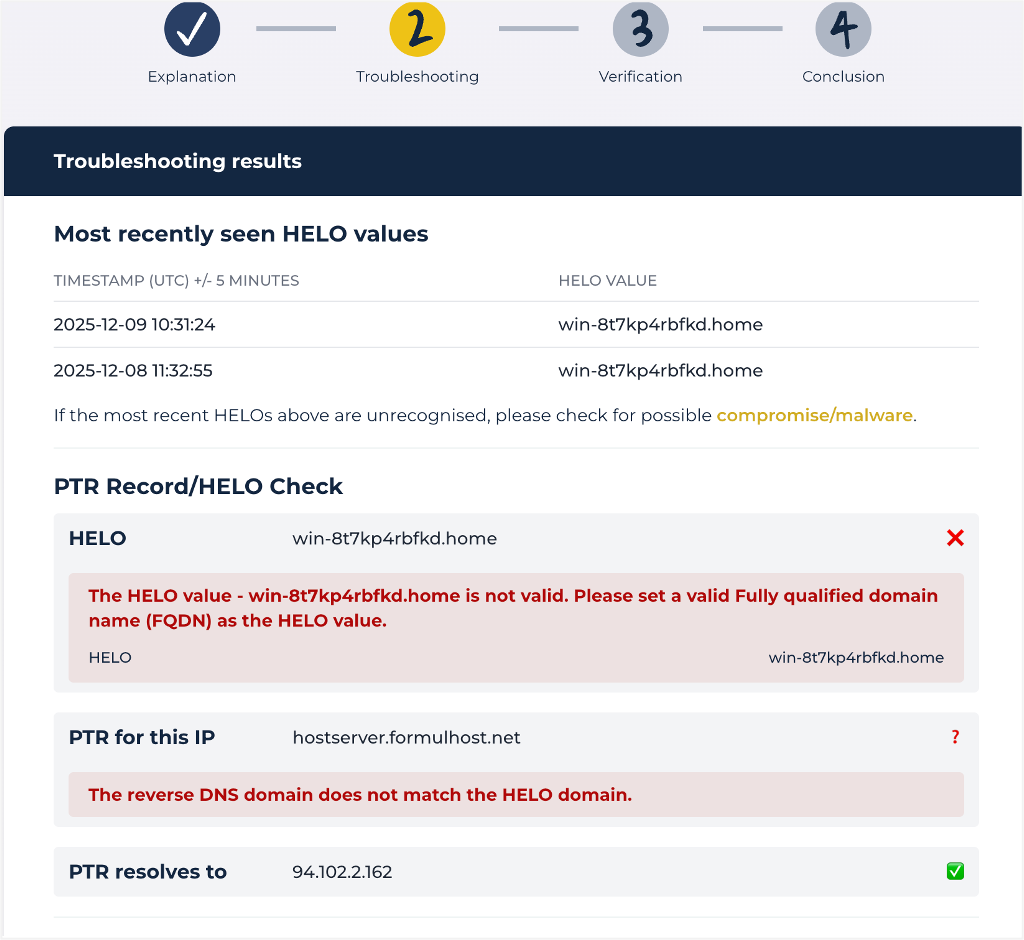- HELO Resolution: Whether the HELO domain resolves to your sending IP address in public DNS.